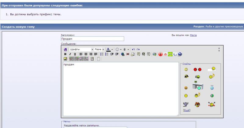 При создании темы в разделе продам, раздел - Рыба и другие пресноводные животные, просит проставить "префикс темы", но где его поставить окошко не появляется, пробовала в разных браузерах, на разных компьютерах.