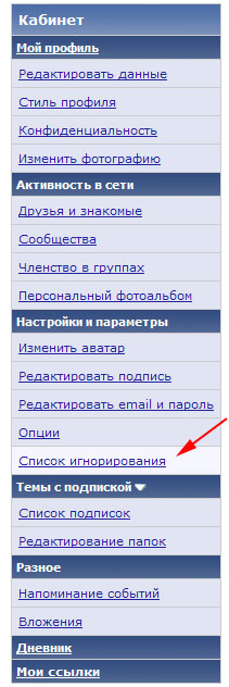 Мой кабинет > Настройки и параметры > Список игнорирования