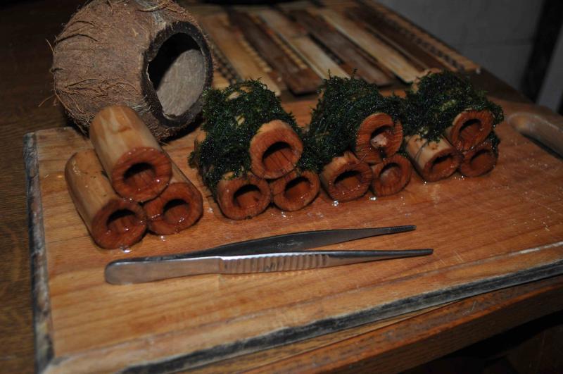 4 шт домика для креветок, дерево вишня, длинна - 4,5-5см, даметр внешний -3см, диаметр внутренний - 1,5см., вимочены, выварены, тонут.