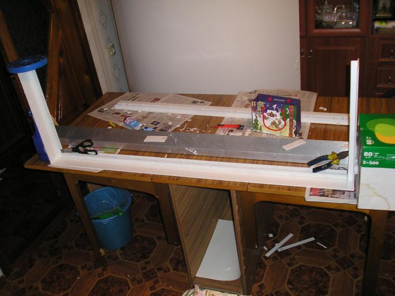 Крышка из 3мм ПВХ. Купил, а потом подумал - хлипенький он...добавил ребра жесткости и все гуд. Клеил космофеном, клеит - жир! Просто и удобно. Так же едут 120мм вентиляторы, будет охлаждение на лето, профиля, выброс горячего воздуха из тумбы и БП.