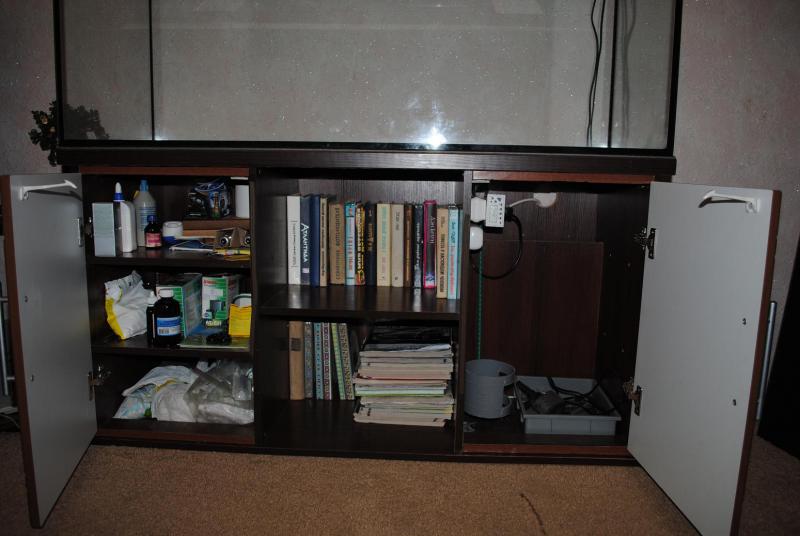 2. Тумба, 16 мм ДСП, цельные листы - дно, задняя стенка, дверцы - МДФ, две тумбы и полка. Несущая плоскость выполнена из двух листов ДСП 16 мм, оклеенных широкой кромкой. Сзади прорезаны технологические отверстия. Внутри - держатель баллона СО и цифровой таймер. Подложка под аквариум - 10 мм изолон.