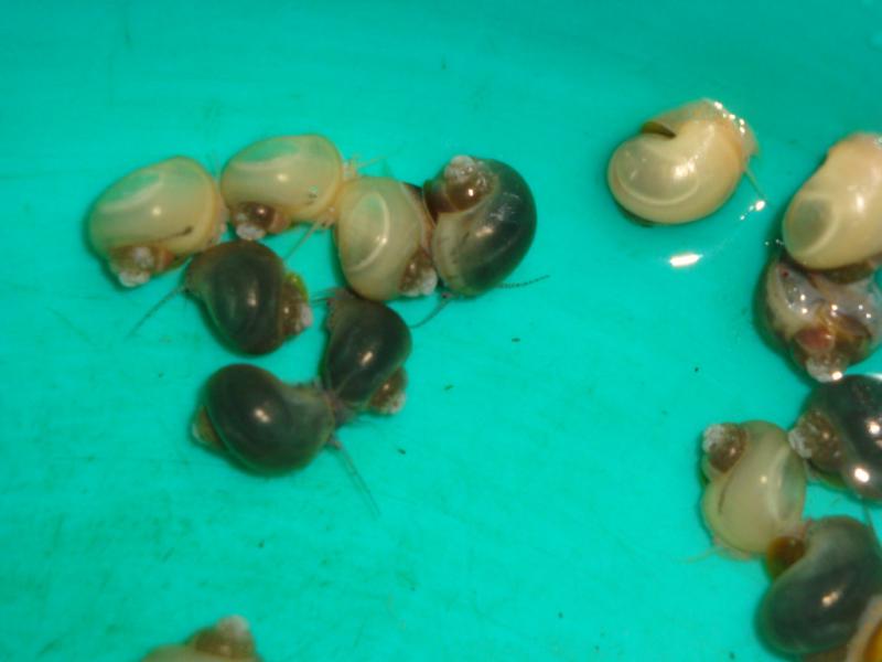 Улиточки активны, веселы, воспитаны с отличным аппетитом. Выращены на сомовьих таблетках, капусте, огурчике, сушеных листочках. В этом возрасте они активно чистят аквариум от обрастаний и излишков пищи. К растениям равнодушны.