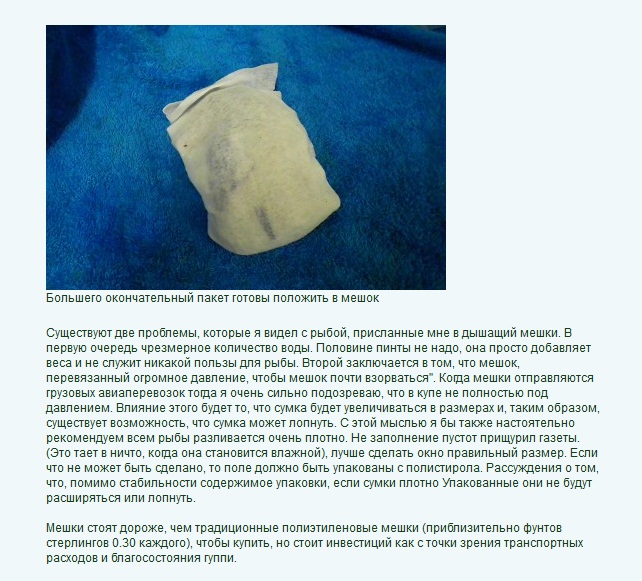 Новые технологии перевозки рыбы , новые технологичные материалы. Эта технология разрабатывалась в нучноисследовательских целях . Кульки из мембранного пластика Kordon . Кульки [B]Kordon , [/B имеют возможность передачи молекул газа через пластиковые - мембранные стенки кулька углекислого газа и кислорода в часности . Пока есть пригодная для дыхания атмосфера вне кулька , гуппи внутри кулька будут чувствовать себя нормально . Это новый "фантастический" способ транспортировки гуппи , особенно если продление сроков /по времени/ транспортировки необходимо . Упаковка занимает совсем мало места - см. фото . На остальных фото статья с подробными пояснениями . . .