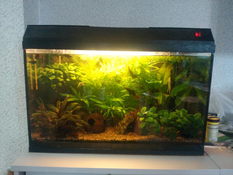 Сейчас в аквариуме живут - 2 гурами, 1 меченосец, 4 анциструса, 1 лабео, 1 скалярка и еще 3 мелких рыбки, названия которых не знаю. Из растений - лимонник, названия остальных растений я затрудняюсь назвать.