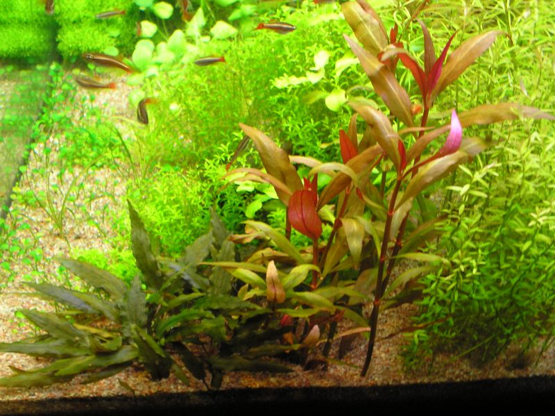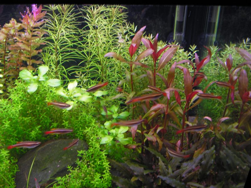 Аквариум с расборами выглядит получше, чем тот, где куча разных видов. Но я бы нимфею убрал с переднего плана.