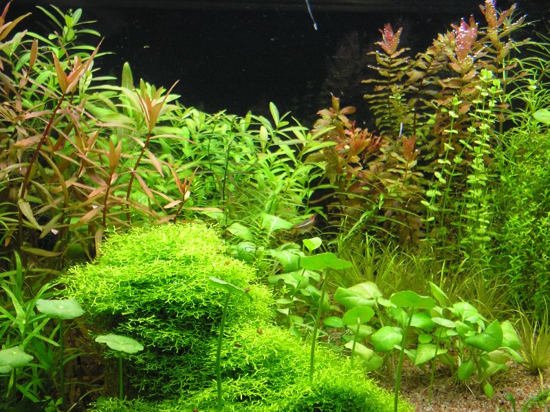 Слева сзади больбитис!Он у меня уже несколько лет, рос в разных банках!Он долгл стоит в новых условиях, но если уже прижился,то растет хорошо, но медленно. Где-то, как анубиас, один лист в неделю.Я перед посадкой в этот аквариум пообрезала все старые листья, поврежденные, ну и т.д. Так увлеклась, что куст стал в два раза меньше.  Я никогда особенно не создавала ему особенных условий. Знаю, что в мягкой воде растет лучше.