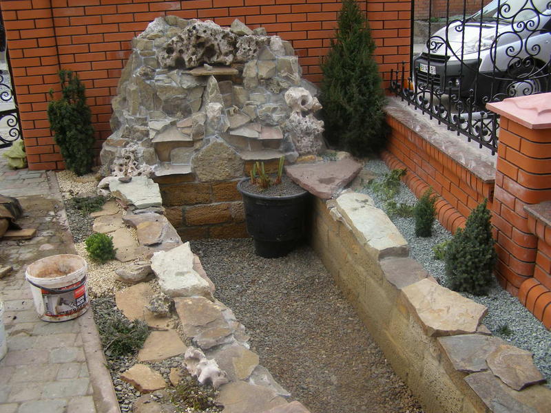 Будут кувшинки и большуший контейнер с болотниками на уровне воды под струйкой водопада.