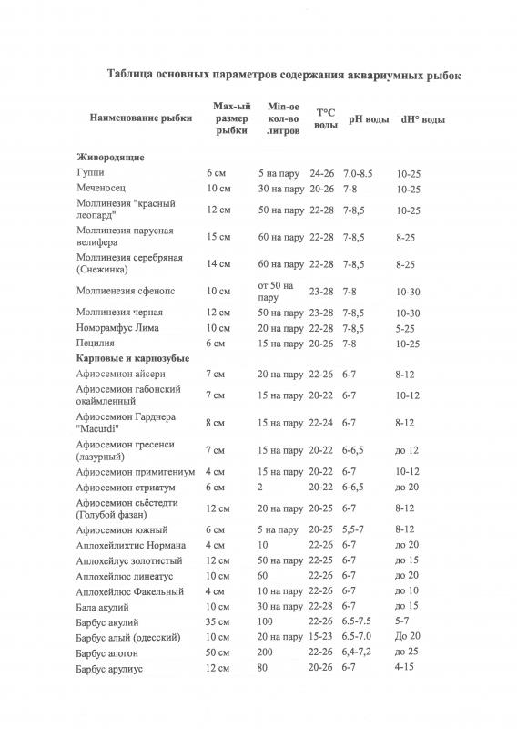 Дополнительно к обсуждению прилагаю таблицу для содержания аквариумных рыбок, она может пригодиться и Вам и другим участникам форума.
