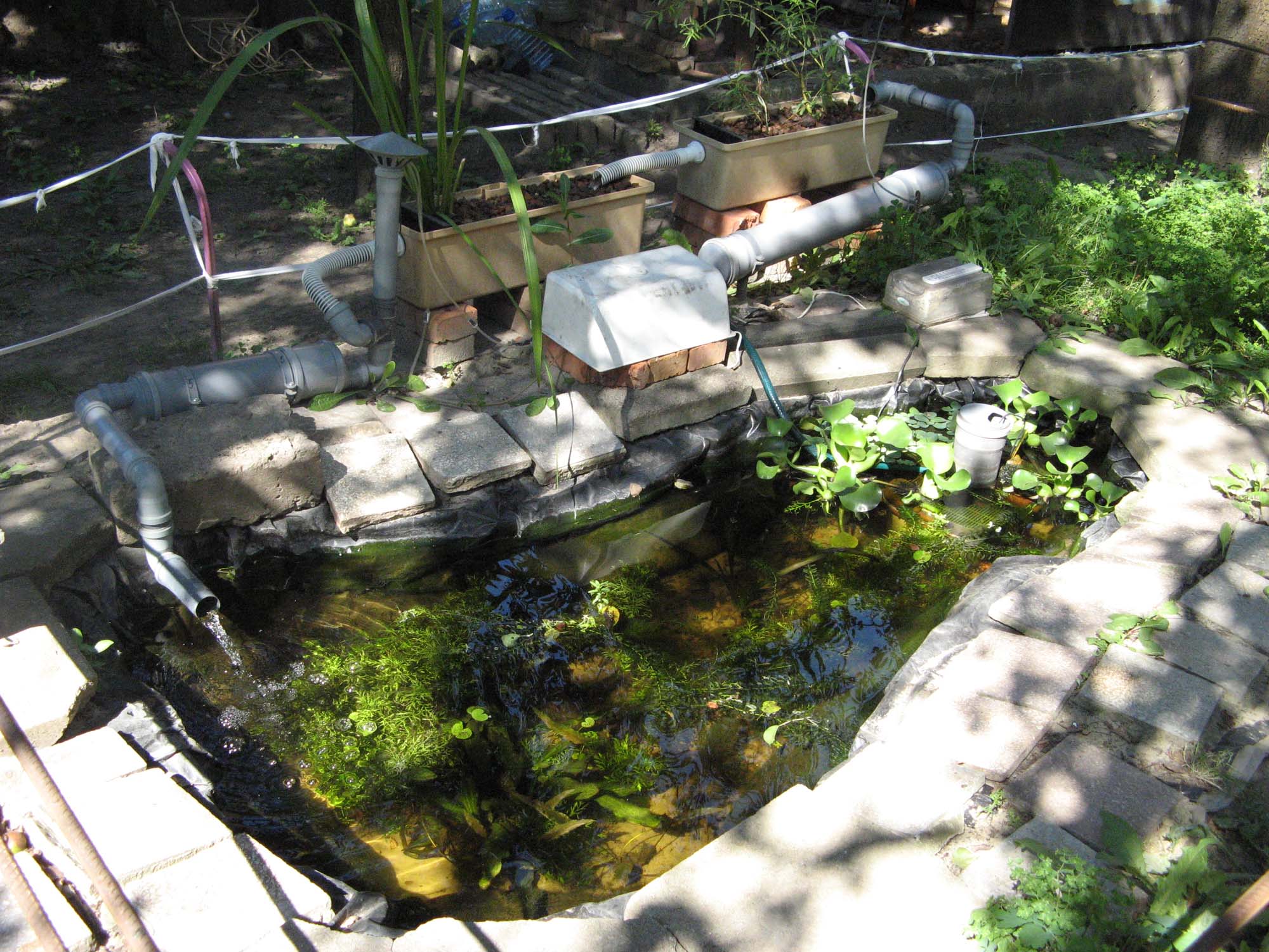 Я взял обычный поливочный шланг усл. Ø25мм (прозрачно-зеленый, из дешевых на «благбазе», ок. 5 п.м и сложил его «плоской улиткой» на бетонной плитке возле пруда, где прямые солнечные лучи попадали бОльшую часть дня. Таким образом, вода внешнего цикла, прогоняемого насосом, стала, проходя через улитку, подогреваться от прямых солнечных лучей.