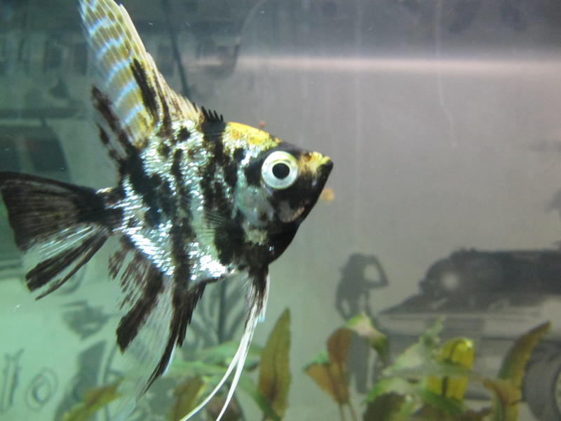 Возможно самец низкоплавничной скалярии. Но так как рыбка затянута в росте могу ошибаться. Ощипывает растения так видимо кормили очень плохо. Какой примерный возраст?