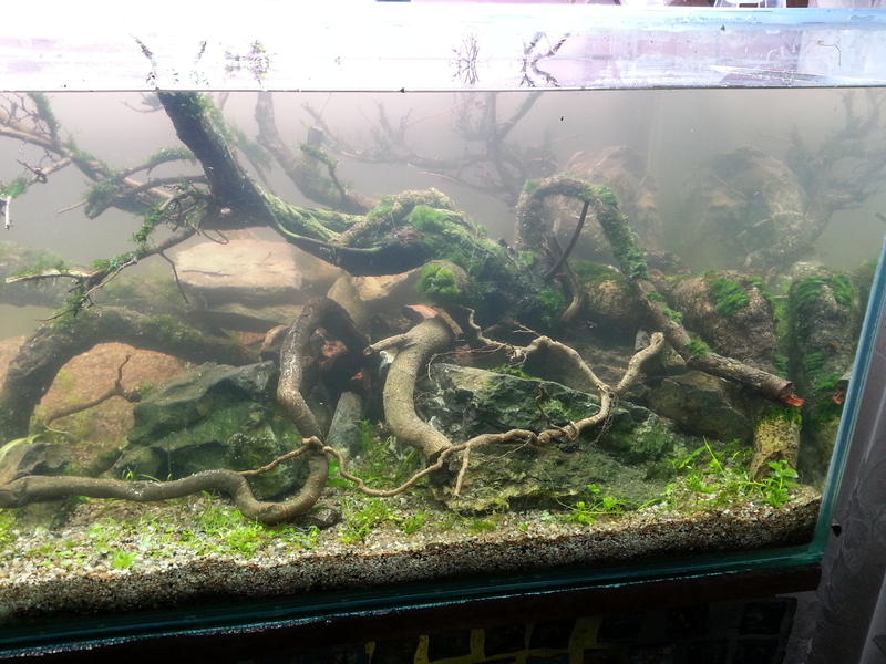 Вот фото.Только мелкие камни под главной корягой уберу.Они пока другую корягу прижимают.И слева камень, который лежит на большом тоже уберу.Справа у задней стенки посадил много индики и перистолистник гуаяна.Не видно еще их.Завтра досажу длиностебельку
