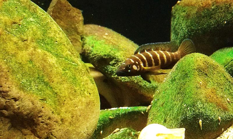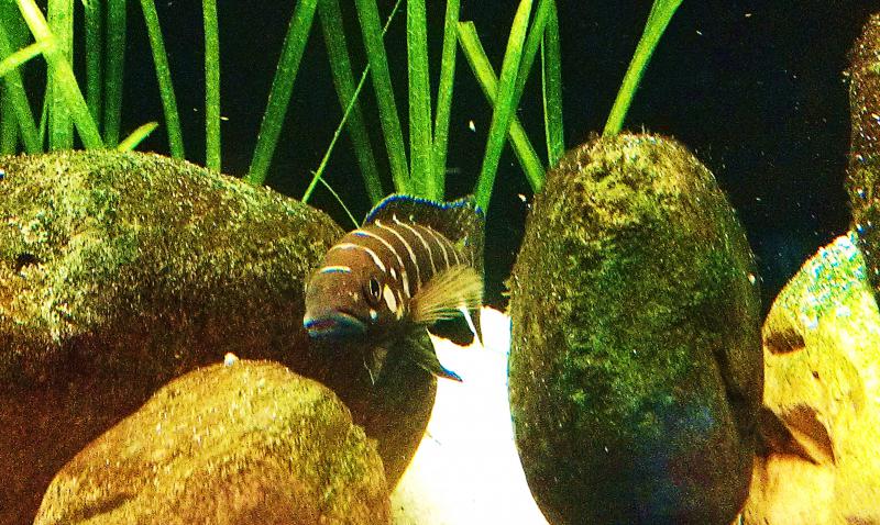Тельматохромисы вроде бы отнерестились.Самочка сидит в рапане а самец отгоняет от гнезда всех рыб,вступая в "бой" даже с самцом цилиндрикуса который тоже сейчас занят охраной своего выводка.На фото самец во всей красе.Последне фото-это он же на охране рапана в котором сидит самочка.