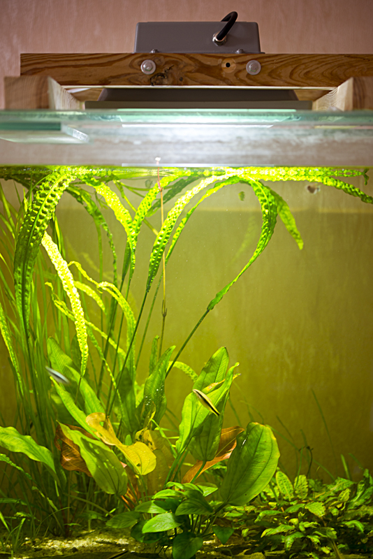 Однозначно ЛЕД прожектора выгодное приобретение. Плюс никакого шума, даже малейшего и лишней температуры. Высота столба воды у меня если от грунта тоже 60 см пока растения прекрасно себя чувствуют, вон эхинодорусы цвести собрались. Но! Поскольку я лично вменяемой инфы не нашел насчет такого освещения в травниках, то все постигается экспериментальным путем. (кстати, если кто, что полезного где нашел, сбрасывайте сюда, думаю всем будет интересно. Желательно про большие диоды, но про наборные (собранные из малых диодов разных цветов) тоже интересно у кого как и что  хотя последний вариант пока экономически не интересен из за высокой стоимости диодов и потребности в их большом количестве даже на небольшую банку) Так вот. Тяжело сказать как поведут себя капризные растения, например ситняга, ротал, кубы, последняя так вообще штука капризная на свет. Если вы хотите создать именно травник с коллекцией сложных растений, думаю нужно ставить помощнее 70W/ Или придется подождать и посмотреть, что выйдет у меня  Сейчас стоят полтосы, я посадил бликсу, ситняг, кубу и пару ротал для эксперимента, если не хватит добавлю 70w Во всяком случае по мощности света, температуре цвета и тд. они подходят. Оговорюсь еще, что кормить СО я не буду, это мой принцип, только жидкие Удо и голубая глина в корни. Сори за корявую фоточку снял наспех, потом заменю. Вот на временной констркции, кстати очень все просто, деревянная рама, снизу защитное стекло, чтоб от пузырьком не матовело стекло прожектора, как видно растения зеленеют, разве только что не пузырят, но я пока за этим не гонюсь.