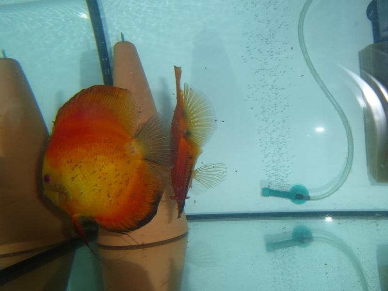 Только проговорил,сегодня кормящая пара пидженов(10,5 месяцев,самец змея еще и недокрасился) с мальком на плечах(1 нерест) начала интенсивно чистить конус,а самка примерятся ложить,быстренько снял малька и сделал подменку до нужных параметров,через пол часа начали кладку,ото припекло