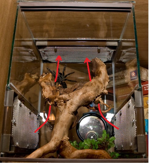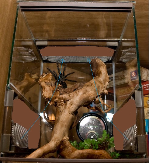zilbern, сами посудите, даже если террариум будет стоять в слабовентилируемой нише, то всё равно воздух будет циркулировать, в вашем случае будет сквозняк. Если сложить вентиляционные проёмы, то образно это емкость без одной стороны, как ведро без крышки, в такой емкости поднять влажность до нужного уровня будет проблематично, что может пагубно сказаться на питомце. Из-за такого расположения вентиляции, поток воздуха будет проходить у задней стенки (рис. 1) так как это наименьший путь и для потока наименьшее сопротивление, что в свою очередь будет создавать зоны сквозняка и зоны застоя воздуха. Как и советовал Влад, перекройте часть вентиляции, к примеру оставьте полоску вентиляции сверху 3-4см, и боковые перекройте как на рисунке 2, это обеспечит максимальное отдаление вентиляционных проёмов. При таком расположение и размере, воздух будет равномерно идти по диагонали захватывая максимальную часть объёма, минимизируя зоны застоя.