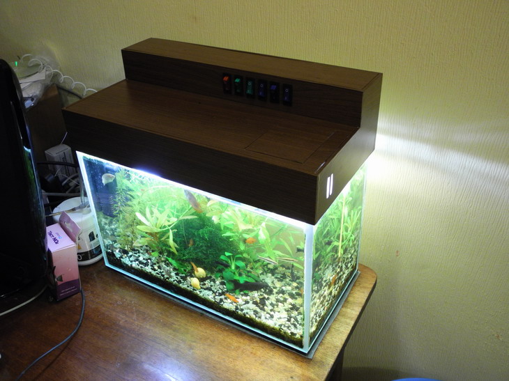 До недавних пор я считал, что для аквариума-для-красоты вполне достаточно оргстекла сверху. Ошибался. Однажды мне надоело двигать оргстекло, поправляя светильник, шнуры и трубки на аквариуме при каждой кормежке. Надоело мостить светильник на стенки аквариума при чистке. Надоели 4 шнура в 4 розетки под столом (отдельный удлинитель с тройником). И решил я склеить крышку. Жена сказала - "Не мучай мОзги - купи!" Нет это не наш метод, я <зачеркнуто>построю свое казино с блэк джеком и...</зачеркнуто> склею сам так как хочу и что хочу и не буду никого напрягать своими "бзиками", особенно учитывая свой перфекционизм. Забежав вперед скажу, что я бы такую работу, что я сотворил, не принял бы