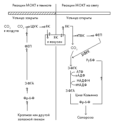 САМ фотосинтез происходит аналогично, только яблочная кислота никуда не транспортируется, а синтезируется ночью и накапливается в вакуоли, а днем декарбоксилируется и образующийся СО2 уходит в цикл Кальвина. Развитие этого типа метаболизма у суккулентов связано с необходимостью закрытия устьиц в дневное время для уменьшения потери влаги (т.е. как раз когда необходим газообмен для фиксации СО2). Т.е. они первично фиксируют СО2 ночью, но для фотосинтеза используют его днем. Разумеется, для них дополнительные потери энергии не проблема - солнца хватает.