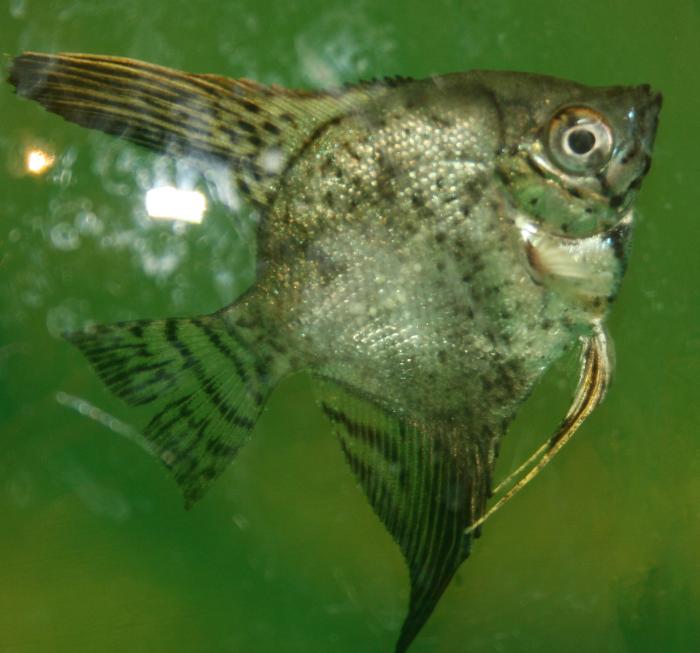 потом одна скали умерла вообще без симптонов, на бок лягла и через час замерла, на оставшихся рыбах пятен не было они кушали хорошо, поэтому через 4 дня я их отсадил в 3л банку с костапуром для вожможной профилактики но у скали начали появлятся вот такие пятна, на гнойники похожие, кушать перестала, кстати насчет испражнений были белые как слизистые а сейчас не кушает и не испражняется соответственно двигаться как то рывками стала, не реагировать когда по банке пальцем постучишь и набок валиться стала.