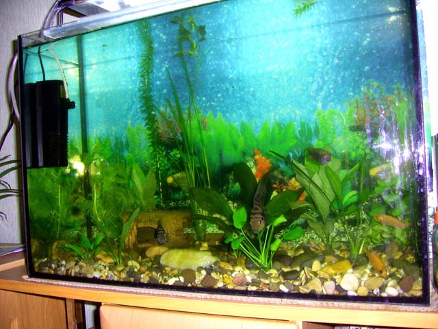 хочу в ближайшее время аквас на 200 приобрести..только еще с рыбами толком не определилась. хочется каких-нибудь крупных и интересных цихлид,но чтоб с парочкой чернополосов уживались.. может посоветуете кого-то?  а это мой теперешний небольшой на 60 литров.