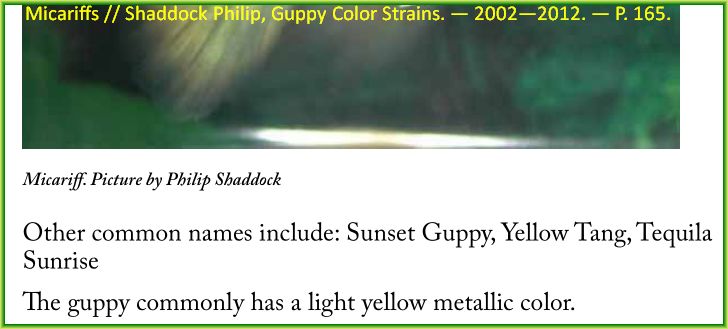ОгнеЛо, У меня к сожалению . мало времени проводить с Вами дискуссию по поводу названия моей рыбы , которое я и так знаю . Тем более , что рыбу с таким признаком Вы видели только на картинке... и приводите сноски непонятно на какого-то модератора Валеру. Филип Шедок - извесный в мире гуппи персонаж , и Вы его знаете - приводите сноску на него в своем блоге , в часности намекая на В.В.Сторожева и С.Апрятина " /см. фото 1/ - от сюда http://aquaria.ru/node/11801 . Поэтому думаю , что мнение Ф.Шеддока для вас что-то значит , привожу фото из его книги Guppy Color Strains о генетике признака микариф на стр.161-165 . На 2 фотографии - фотографии Ф.Шедока рядом с моей фотографией - даже несмыслящий в гуппи человек скажет , что на фото одна и таже рыба , и этот признак называется МИКАРИФ ! . .