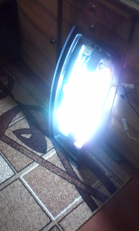 переделал крышку на днях, мало света было, на светильники денег нет.., сначала думал добавить Т5 лампу, но потом пораскинув мозгами и окрутив крышку решил вставить стандартные патроны и компактные энергосберегайки., перенес ЭПРА на заднюю стенку, вырезал часть ниши, вставил патроны, сделал проводку, залил все горячим силиконом, лампы поставил 2 по 35В 6400К, сначала убрал одну Т8 и вместо нее были пластинки светодиодов (купленые уже давно), но потом решил вернуть и вторую Т8 и светодиоды перенести немного вперед (на фото к сожалению еще первый вариант с одной Т8), когда ставил назад Т8 и перемещал диоды сделал сверху люки для вентиляции и наклеил на них для декоративности (и чтоб свет в потолок не лупил) решетки пластиковые для бытовых вытяжек (тоже к сожалению не сфотографировал это изменение).., и того две Т8 по 20В, 5 планок с диодами - вроде как 22В вместе, и две по 35В, получается 132В на 115 л. аквариума)