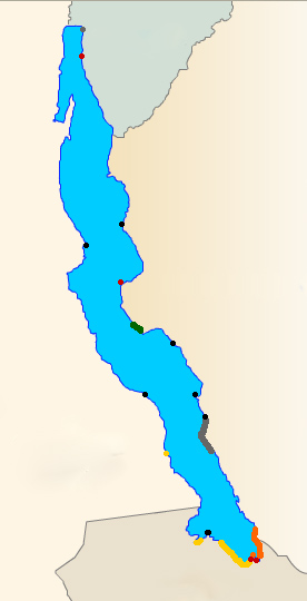 Карта 3. Достопримечательности отлов Altolamprologus зр. "Compressiceps Shell". 1 - Rutunga; 2 - Румонге; 3 - Кабве; 4 - Mbity Остров (= Kumbula Остров); 5 - Мыс Nangu; 6 - Sumbu; 7 - Мыс Kachese; 8 - Chimba; 9 - Кэмерон Bay. Черный - . . зр "compressiceps Shell" черный (место 1, 2,