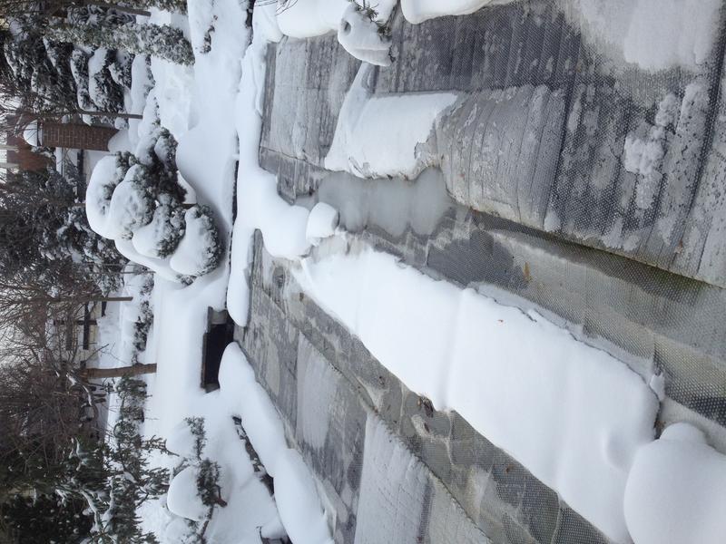 И еще , если пойдет дождь или снег , сверху будет собираться вода и притапливать пленку , не паниковать , у меня такая длинная бамбуковая палочка , сантиметра 3 в диаметре , вот по самой серединке этой лужи и пробиваю дырку ей , за какое то время , пузырьки на плёнке поднимут ее , а вода через эту дырочку попадет в пруд .