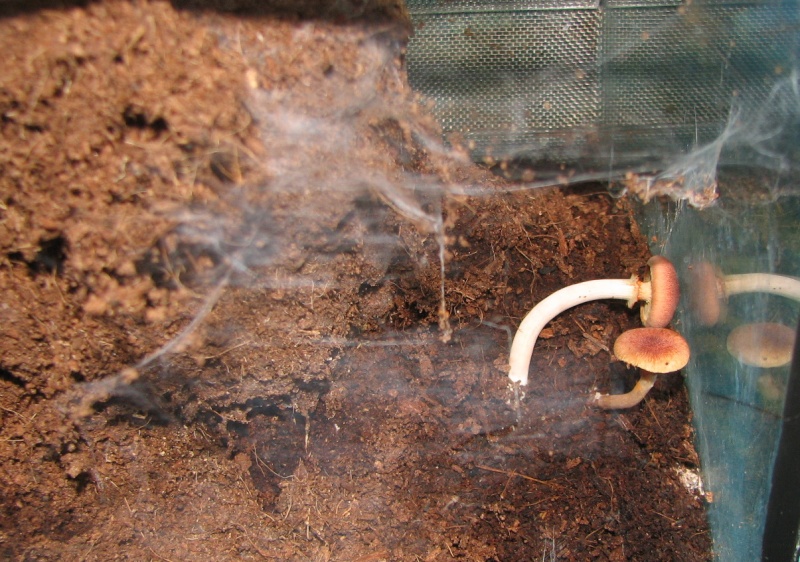 Ну, высшие грибы не вредят паучью, так что даже хорошо, красоты добавляют. У эмилии постоянно растут красивые оранжевые, появятся опять - сфоткаю. Пытался даже пересаживать в мокрые терры, но там мое "противоплесневое биологическое оружие" жрёт органику в любых проявлениях