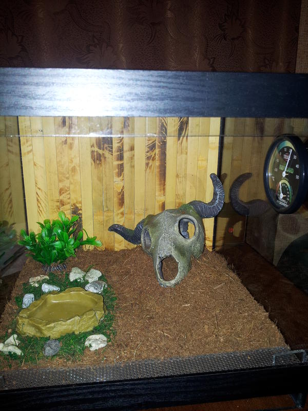 Поделюсь я своим первым арахноскейперством) В декабре приехал терр, обклеил плёнкой. Самой большой проблемой стал фон. Хотелось что-то красивой и объёмное. Заказал у местного мастера (имя называть не буду, человек вполне хороший), но фон после установки и, возможно, под действием влаги, очень сильно издавал запах краски, причём весьма токсичный и не проходящий в течении 2 недель. В общем, фон пришлось выкинуть. Пока что альтернативу нашёл в бамбуковых обоях. В планах всё таки что-то более интересное, возможно, сделанное своими руками, но в финансовом плане в единичном экземпляре делать это не выгодно. Так же в будущем заменю кактус на более симпатичный и большой. Грунт пока не увлажнял, жду пока проветрится силикон в "зелёном участке". Терр для самки Б. Смити. Критика приветствуется