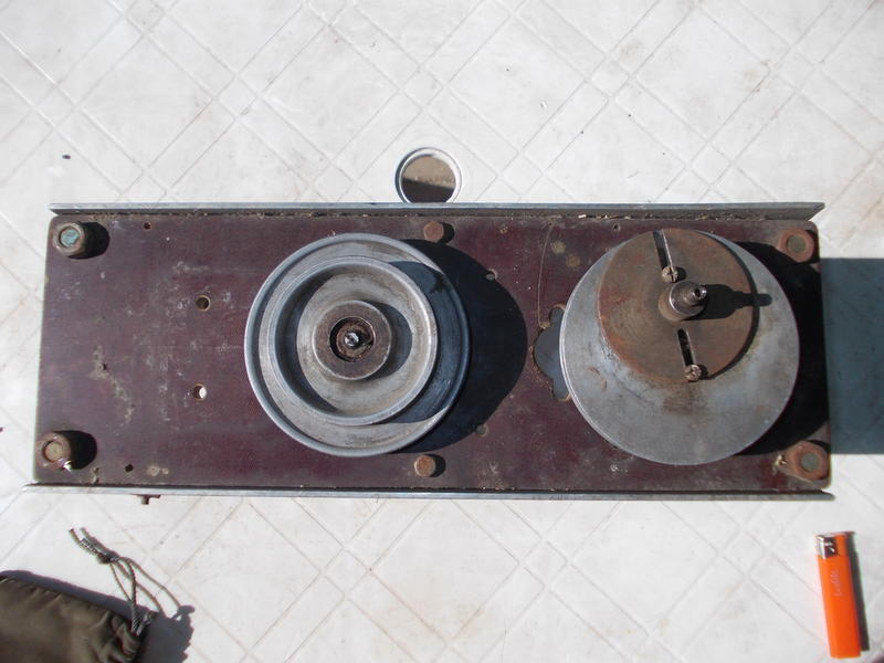 На фото только два шкива, самого компрессора там нет. На одном шкиве прикреплён вал с регулируемым экс центром, который скорей всего приводил в движение какой-то поршень, или что то другое, для чего нужны поступательные движения.