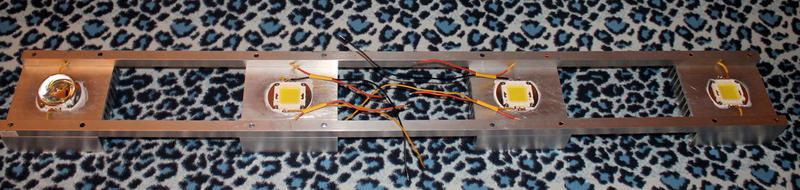Конструкия представляет из себя 4 аллюминиевых радиатора, соединенных между собой, на которых смонтированы 100Вт матрицы светодиодов с оптикой.