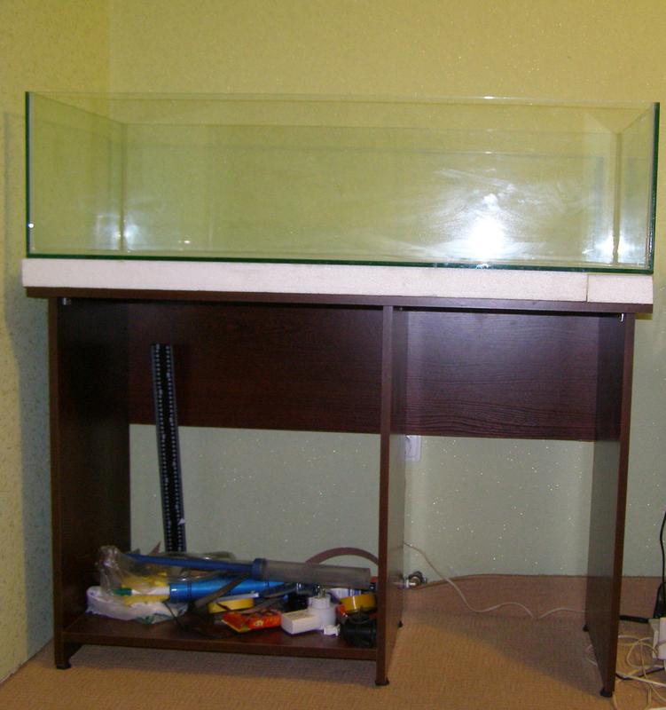 продам 110-50-30см.Фронтальна і тилова стінки з 10мм скла.Все інше 8мм. Поклеєний синій фон на задній. Фото на момент виготовлення акваріуму. Три роки експлуатації.