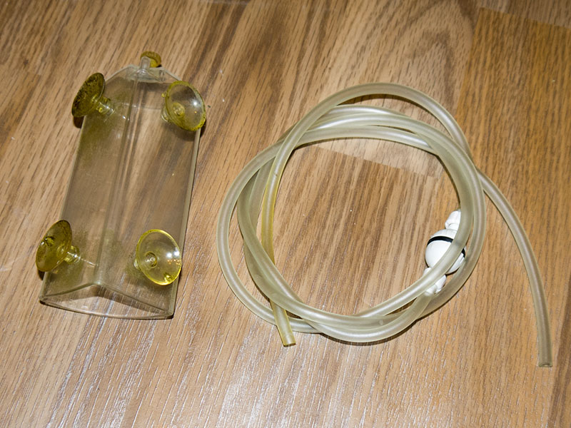 Есть переходник на аквариумный 6мм шланг, комплектная запасная прокладка, инструкция.
