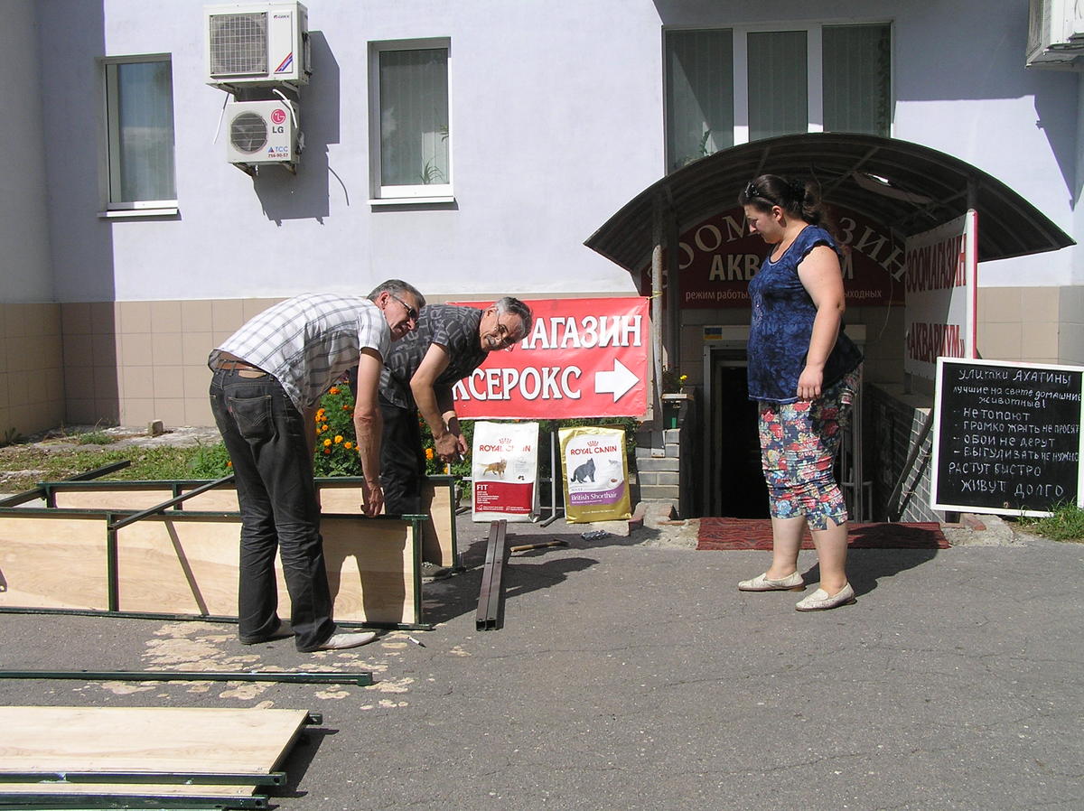 ...Работа шла не только внутри ,но и снаружи помещения.Владимир с помощниками изготовил,собирают и устанавливают новые более прочные стеллажи для крупных акавариумов.Наверное и рыба будет очень крупная?Или мелкая-но много..