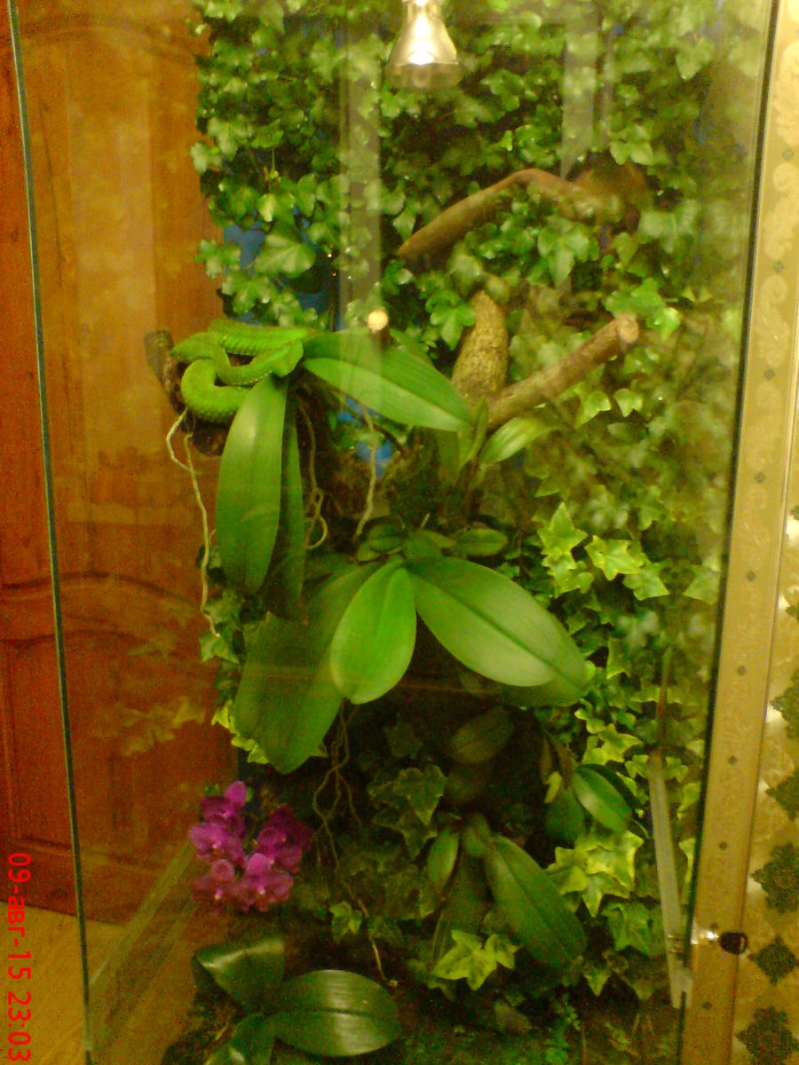 плющ свою задачу выполнил заплел всю практически заднюю стенку и вот так выглядит террариум на сегодняшний день. фото конечно не очень но в связи что он стоит на против окна и сверху его осветить не возможно то имеем то что имеем