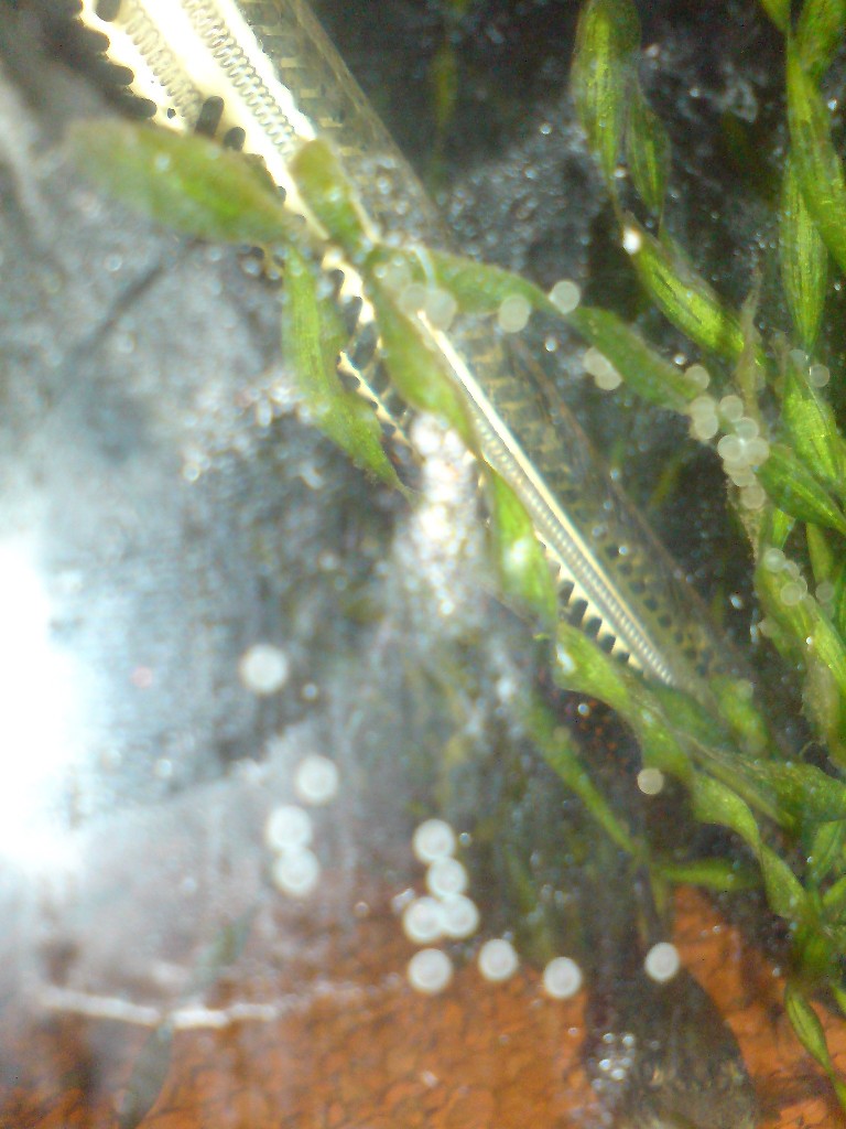 Сегодня утром с икры начали выклевываться личинки. Довольно таки большие. Сфоткать пока-что немогу прячутся (на грунте их не видно).