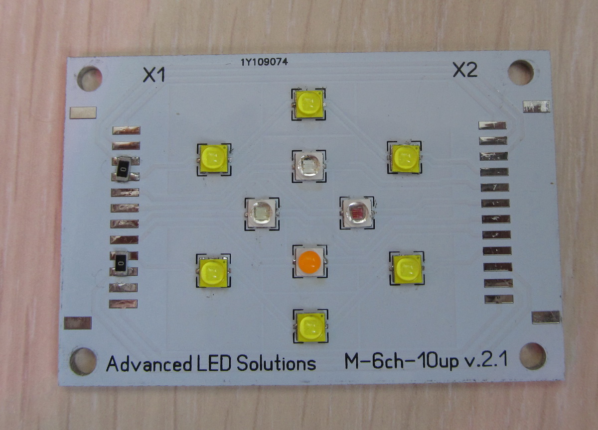 Сборка на 10 диодов - (6 канальная) для травника - стоимость 12,8 уе. Набор диодов (белые Сree XTE -6 шт, цветные Cree XPE2 470 нм -1 шт, Сree 630 нм -1 шт, Lumis 490 нм -1 шт, PK2N-3LPE-ASD - 1 шт). Потребление на токах 1 А -белые, 700 мА цветные (макс) - 27 Вт. Световой поток - 2545 лм, поток PPF 38 мкмоль/c.