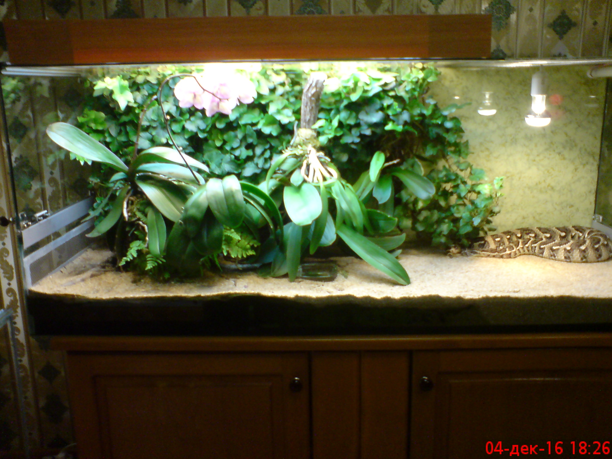 хочу показать как шумящая гадюка лазит по растениям. думаю всем понятно что она не пушинка. но с растениями ничего особого не делается. конечно где то может треснуть листок орхидеи немного но это никак не влияет ни на их рост ни на их цветение. плюща там тоже могут какой то лсток сломать но те листья растут на много быстрей чем их редко ломают. на фото момент именно лазанья