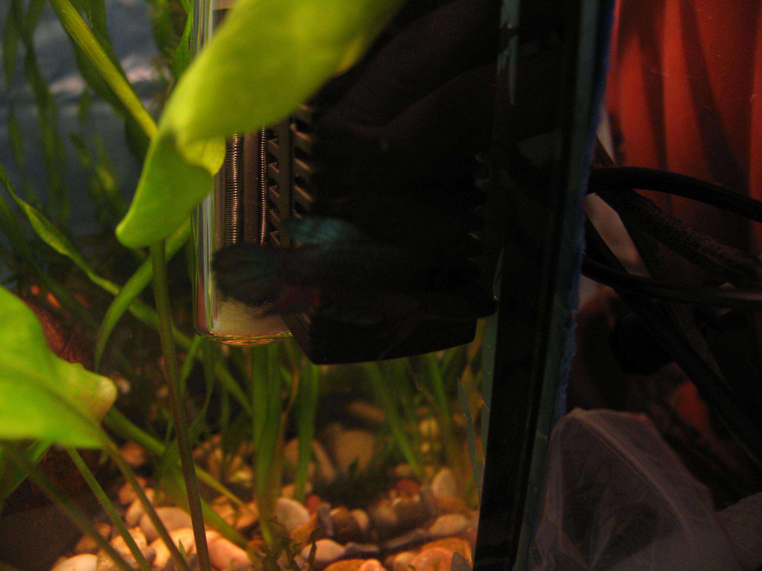 По моему она туда проплывает с видом "ну возьмите меняяя!" . У меня кроме петушков никого нет, цели размножить нет. Только для здоровья чтобы. Поэтому они гуляют в своем аквариуме.