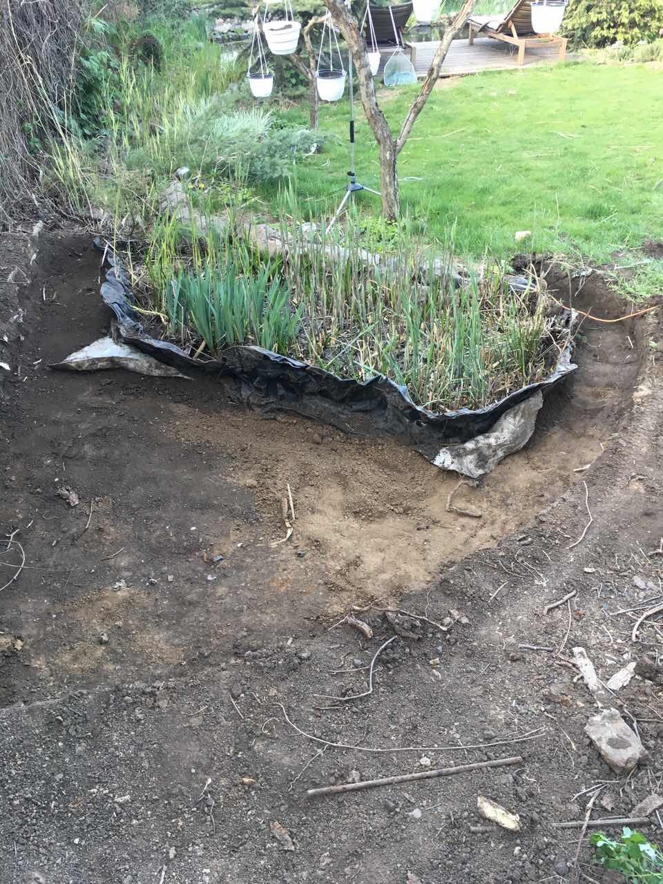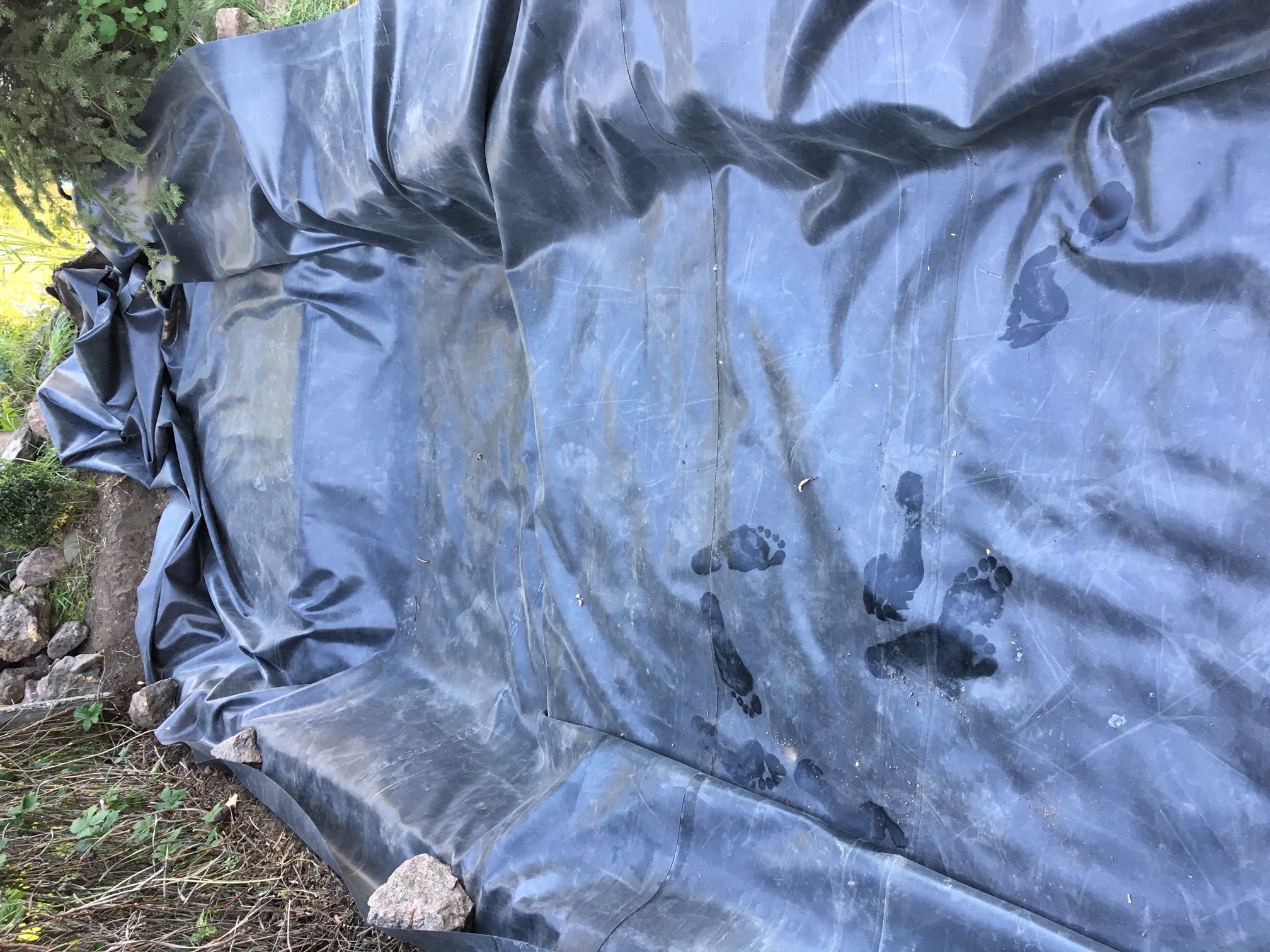 2) В этом году заметил, что моему биоплато и ручью стало тяжело справляться с нагрузкой. Рыбы хорошо кушают и растут, поэтому на выходе имеем много органики. Более того, при циркуляции начал замечать, что уровень воды понижается т.е. есть утечки, т.к. само биоплато и ручей были сделаны на пленке (не резине EPDM) из разных кусков, и даже не склеены между собой. Был просто нахлест и без контруклонов. Короче за 7-8 лет всё это заилилось и нужно было что-то делать. Поэтому было принято решение сделать плановый капитальный ремонт