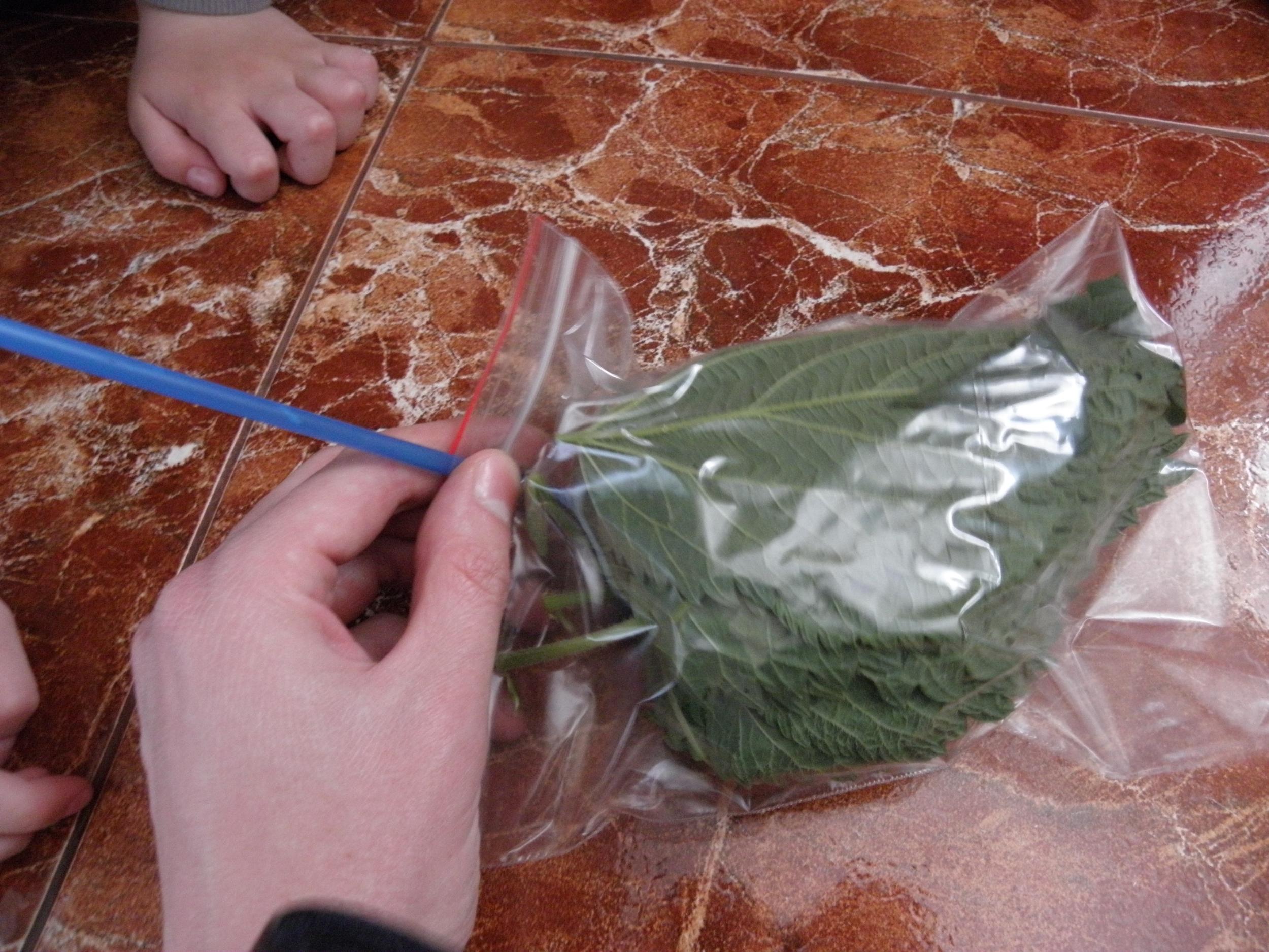Раз надо заготавливать крапиву, то значит надо. Чтобы занимало меньше места в морозилке, то делаем вакуум, отсасывая воздух трубочкой.