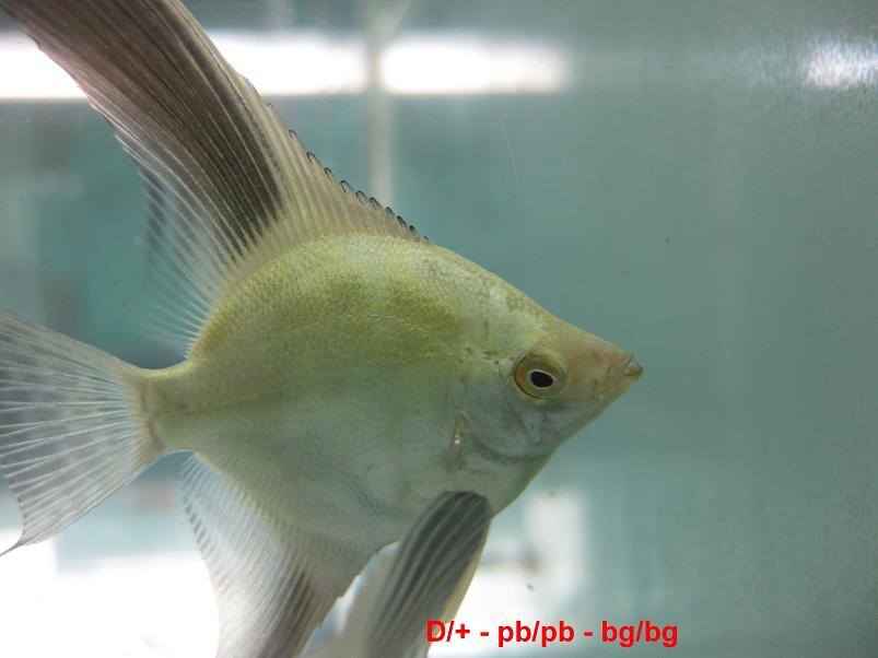 Первая из этих двух скалярий, классическая дикая форма, у которой только новый ген в двойной дозе (bg/bg).