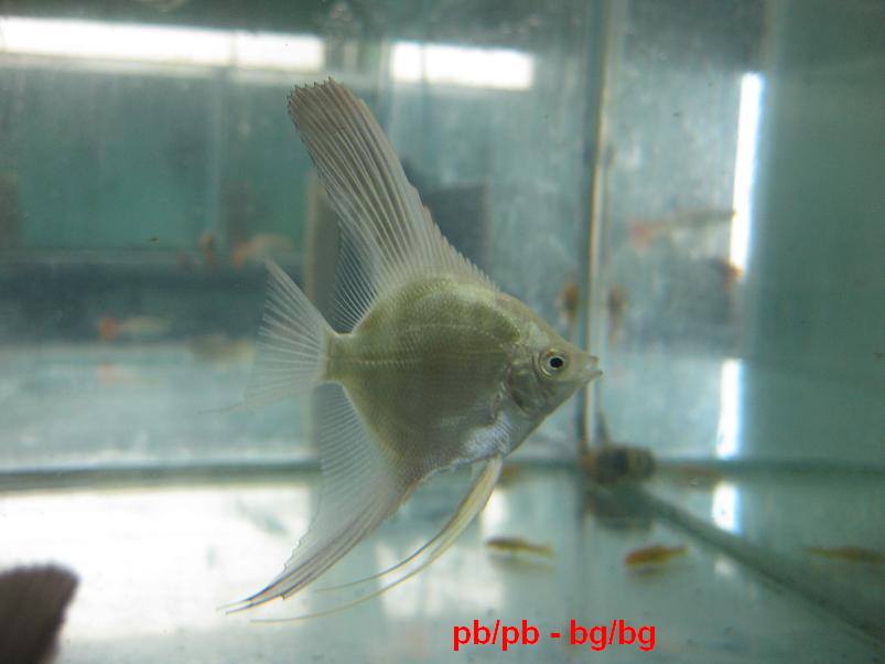 Первая из этих двух скалярий, классическая дикая форма, у которой только новый ген в двойной дозе (bg/bg).