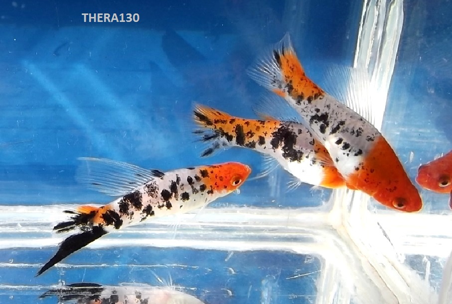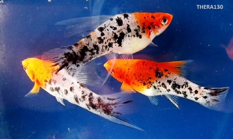 Меченосцы Кои Санке(Сева) , Koi Sance (Showa) ,Трехцветный Кои . Эти меченосцы с белой фоновой(См. пояснения на фото ниже) .