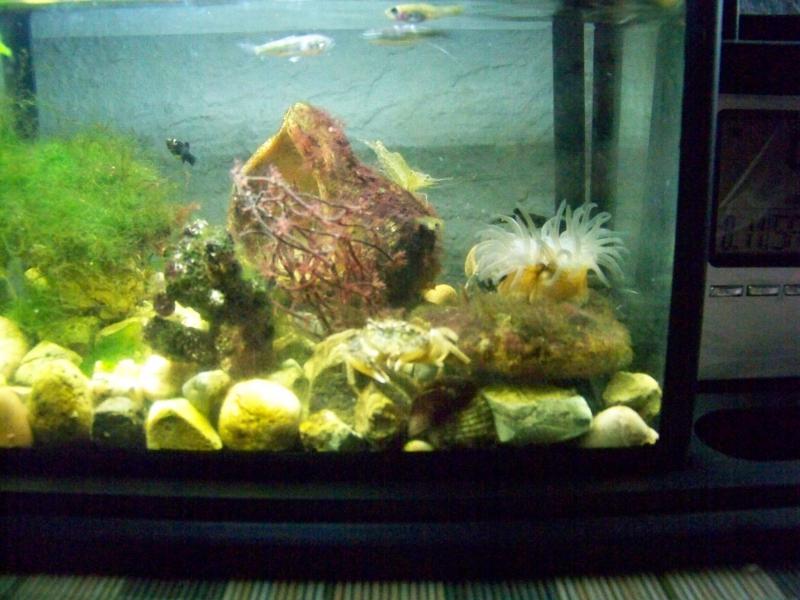 Моему Ресану 4 года. Залита вода из Черного моря. Обитатели: крабы, креветки-палемоны, бычки, морские собачки, монодактилы, селенотоки, кефаль, из живородок - молли (фото с телефона).