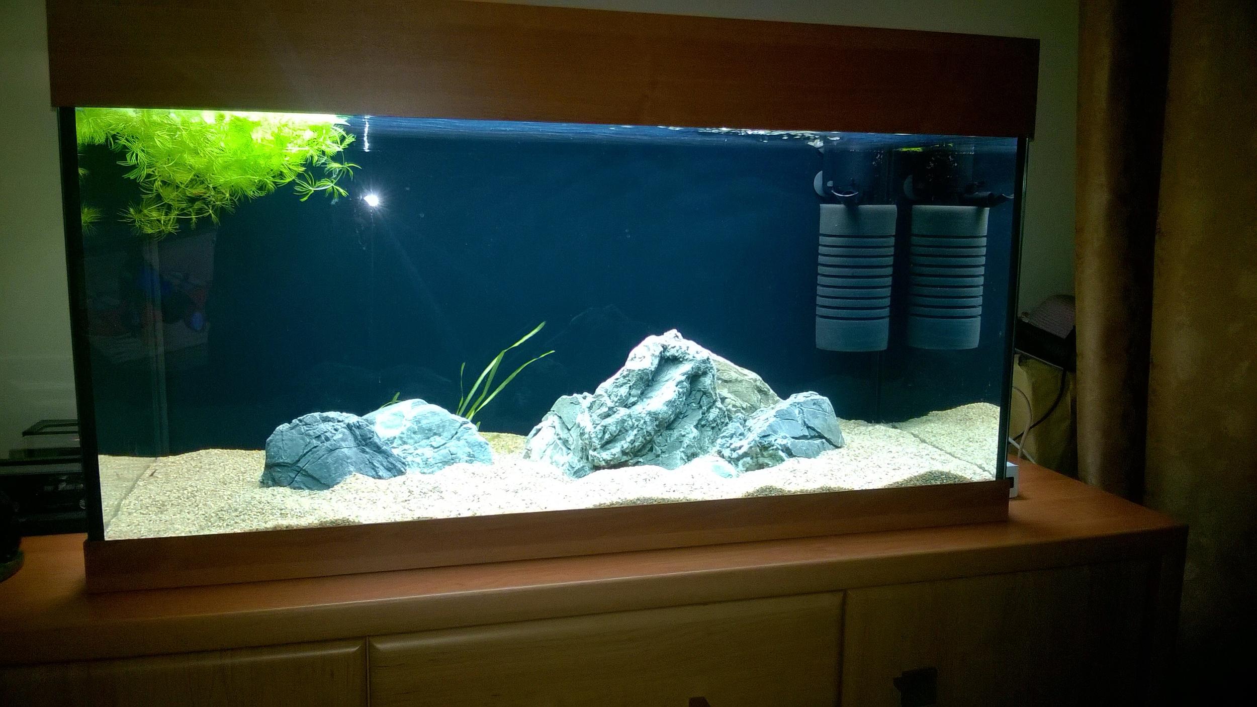 Вітаю усіх любителів цихлід озера Танганьїка. Підійшла і моя черга поповнити ваші ряди. Акваріум 225 літрів 100х45х50, стояв пів року пустий в силу деяких обставин. Останні кілька місяців активно вивчаю форум присвячений Танганьїці і фото дизайнів чужих акваріумів. Несподівано ця субота виявилась для мене вихідним і я вирішив перейти до активних дій. Цілий день крутив каміння привезене з Карпат, перебрав напевно 150 варіантів, і чомусь кожен наступний варіант здавався гіршим від попереднього а попередній відтворити вже не міг, а час нестримно біг до вечора а ще треба помити грунт, трохи перепочив і практично зразу відтворив це що на фото і він як на мене виявився найкращим з усіх попередніх. Вживу чомусь виглядає набагато краще і обємніше.