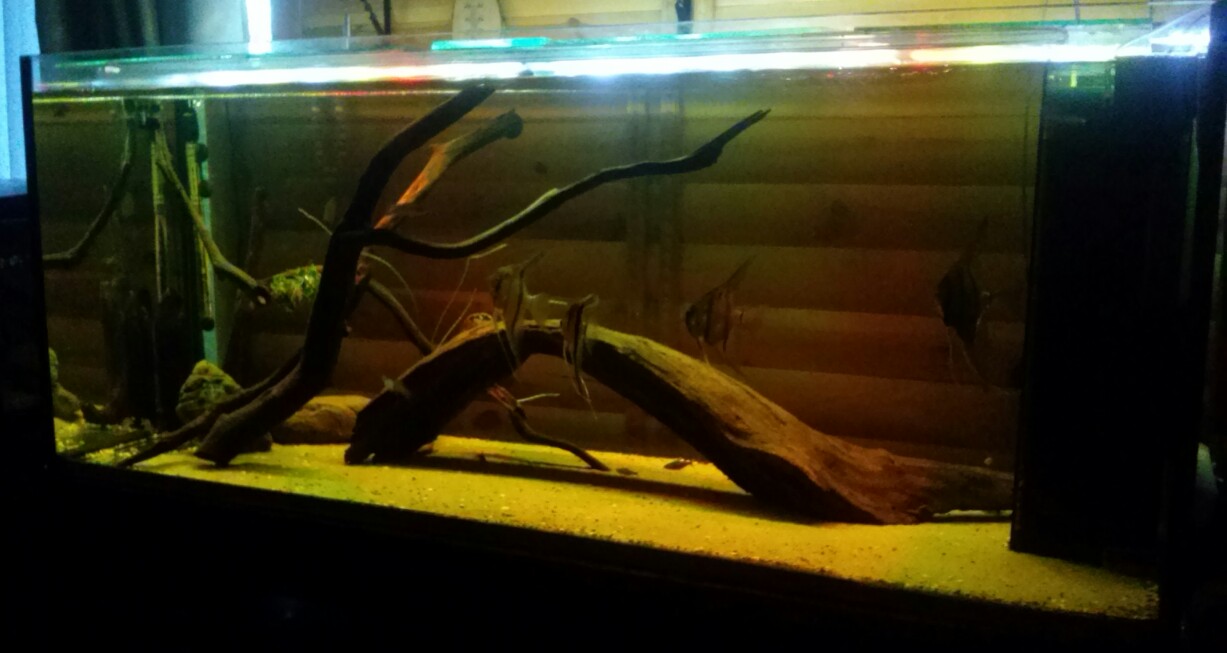 В построении композиции руководился не дизайнерскими канонами, а скорее природными. Ведь в природе , как скалярии так и дискусы обитают больше в деревянно/каменных джунхлях, а не " камышах".