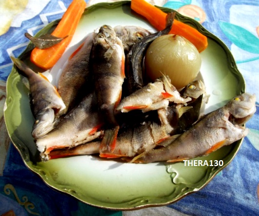Вернемся к теме . Как делается уха из пойманных собственноручно окуней . Окуни потрошаться . Морковь , лук лавровый лист(по вкусу) отвариваются (См. фото 1) . Затем с остывших тушек окуней снимается кожа вместе с чешуей . Кто пробовал чистить чешую у окуня меня поймут (См. фото 2) . Во время подготовки мяса окуня , в бульоне отваривается картофель . Когда картофель почти готов , в кастрюлю с бульоном и варящимся картофелем добавляют мясо окуня , черный и душистый перец , укроп и другие приправы по вкусу . Есть уху можно горячей (См. фото 3) , но мне больше нравится настоявшаяся , загустевшая , холодная уха , на следующий день после приготовления . И еще пикантная добавка для гурманов . В эту уху можно добавить к концу готовки брюшка семги , что придаст незабываемиый , оригинальный вкус Вашему творению . . . .