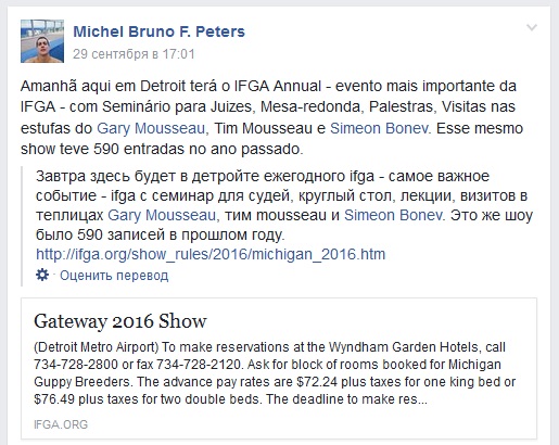 Ув. Сергей Иванович ! Прошу меня простить , поздно увидел сообщение Вашего друга из Бразилии Мишеля Бруно фон Петерс . Дело в том , что на эти выходные он будет в Детройте . Мы как-то упустили , нужно было поехать . Это ежегодный съезд американской International Fancy Guppy Association IFGA основанной в 1965 году . Если говорить своими словами , это самая организованная и мощная организация любителей гуппи , включающая в себя около 70 клубов гуппи из США и Бразилии . IFGA в богатой америке и главное не бедных разводчиков и любителей гуппи , не испытывает никаких финансовых затруднений для свого развития и развития гуппи . Во время этого грандиозного съезда IFGA , будет проведена не менее грандиозная Выставка - Шоу Гуппи . Остается только сожалеть , что мы с Вами Ув. Сергей Иваныч , в этом году не попали на такое мероприятие и не смогли пообщаться с Вашим другом Мишелем . Ведь только меню вечернего банкета заставляет трепетать гурманов и чревоугодников , к коим отношу и себя , а Вас С.И. , тем более - Скрытый текст