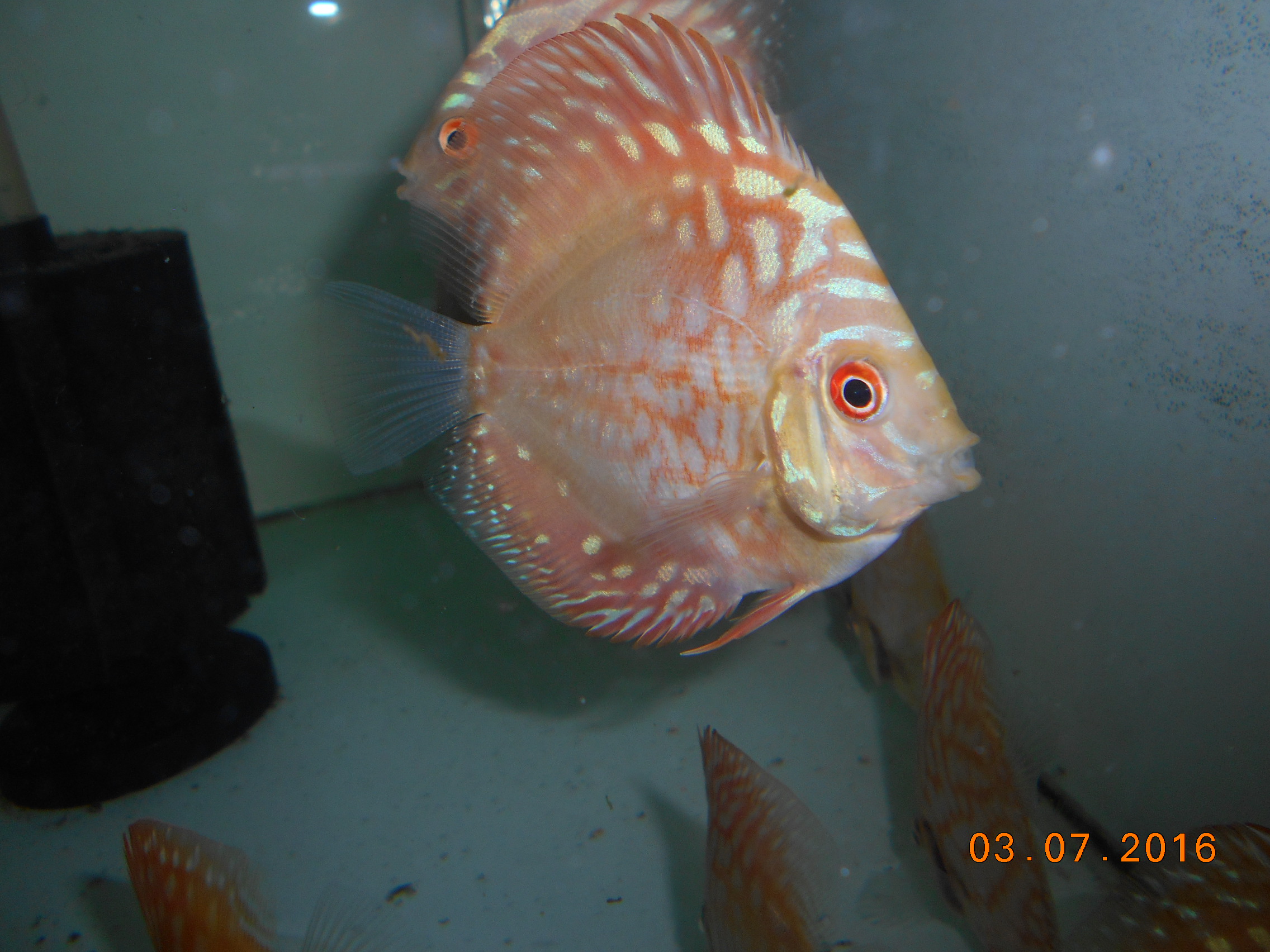 Есть на продажу дискус в размере 5-7см, пока не полностью окрашен, по цене 100грн\шт, - от 10 штук по 90грн\шт, как раз для новичков, кто хочет попробовать но цена была не по карману, сказать с уверенностью какой рисунок будет во взрослом размере пока сложно, поэтому продажа таких как есть.